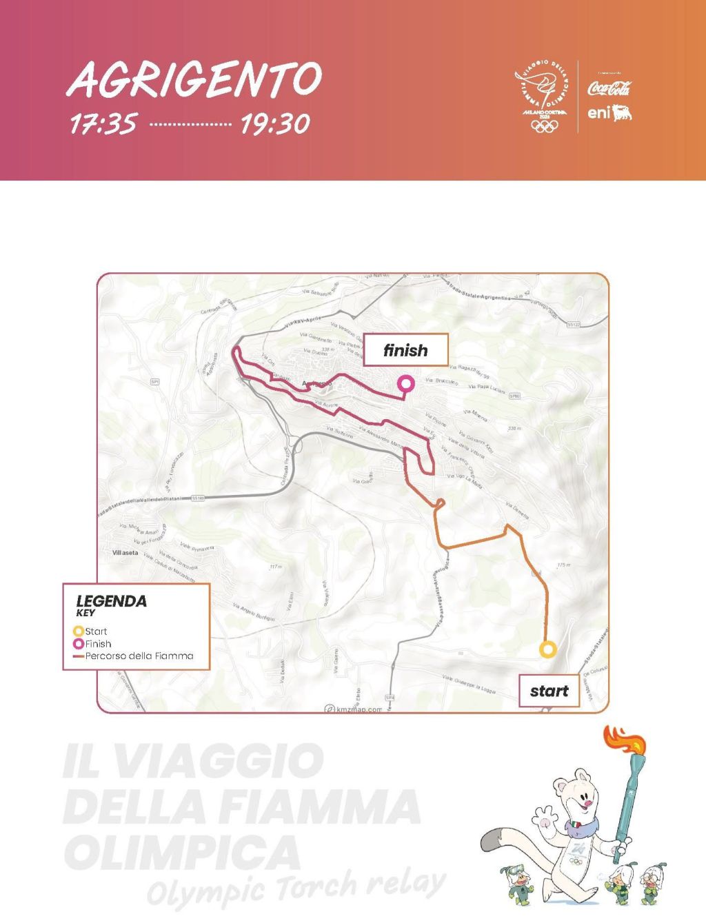 La staffetta della fiamma partirà dal Tempio della Concordia attraverserà la Via Panoramica dei Templi – Bivio Bonamorone, la via Passeggiata Archeologica – Bivio Promenade – Via Petrarca – Via A. Manzoni – Via Esseneto – Trivio Via Esseneto/Callicratite/Dinoloco – Via Callicratide – Via Dante – Via Aviere Volpe – Via Giovanni Finazzi Agrò – Via Garibaldi – Via P. Nenni – Via Empedocle – Piazza Sinatra – Piazza Pirandello – Via Atenea – Piazza A.Moro – e si concluderà in Piazza Vittorio Emanuele in Piazza Vittorio Emanuele dove sarà organizzato il “Villaggio Olimpico” dove si svolgeranno le celebrazioni finali con l’accensione del braciere, un momento di festa e di partecipazione che segna il culmine delle attività nel luogo della city celebration.