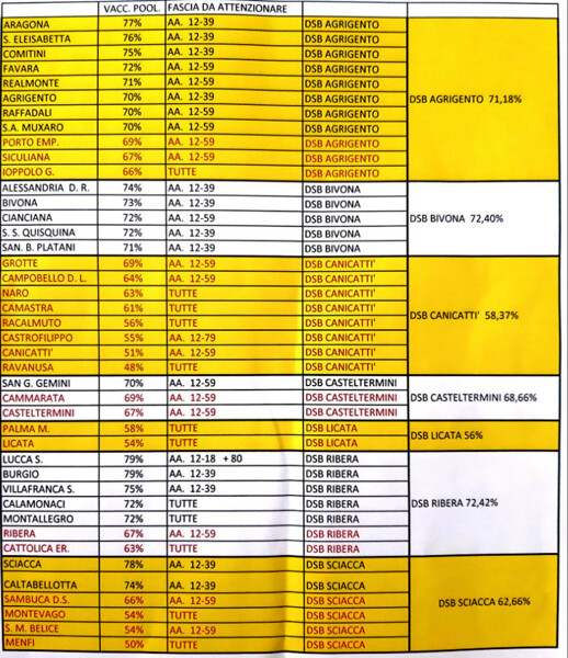 Da 5 mila vaccinazioni si è passati a 2 mila come media giornaliera. Il distretto di Agrigento ha il 71, 18% delle vaccinazioni con i Comuni Aragona, S.Elisabetta, Comitini, Favara, Realmonte, Agrigento, Raffadali, Sant’Angelo Muxaro, Porto Empedocle, Siculiana, Joppolo ; Il distretto di Bivona ha il 72,40%, il distretto di Canicattì ha il 58%, il distretto di Casteltermini ha il 68,66%, Licata ha il 56%, Ribera ha il 72% e Sciacca il 62%.