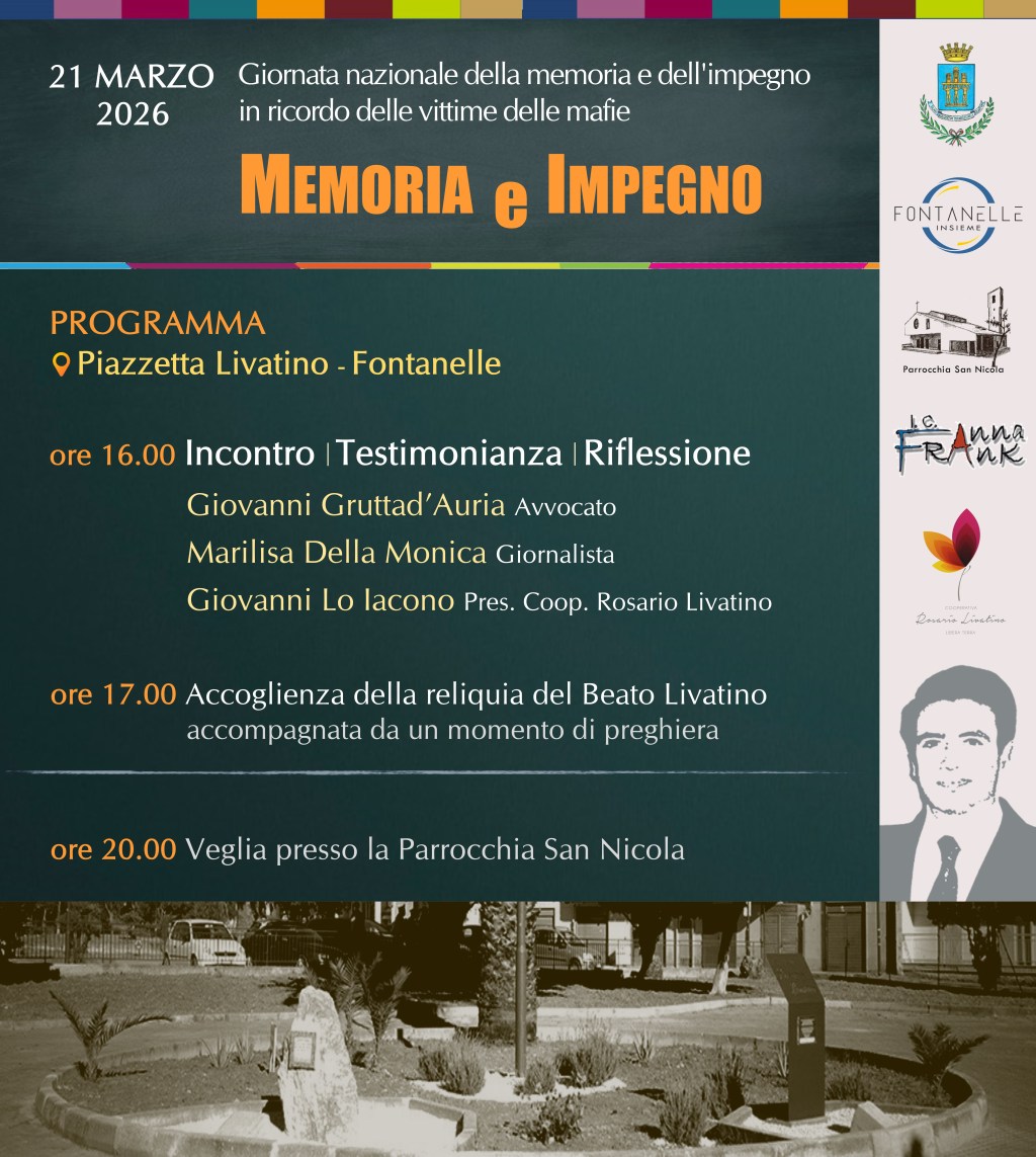 In occasione del 21 marzo 2026Giornata Nazionale della Memoria e dell’Impegno in ricordo delle vittime di mafia, il Comitato di Quartiere di Fontanelle promuove un momento pubblico di riflessione e testimonianza presso la piazzetta dedicata al Beato Rosario Livatino.