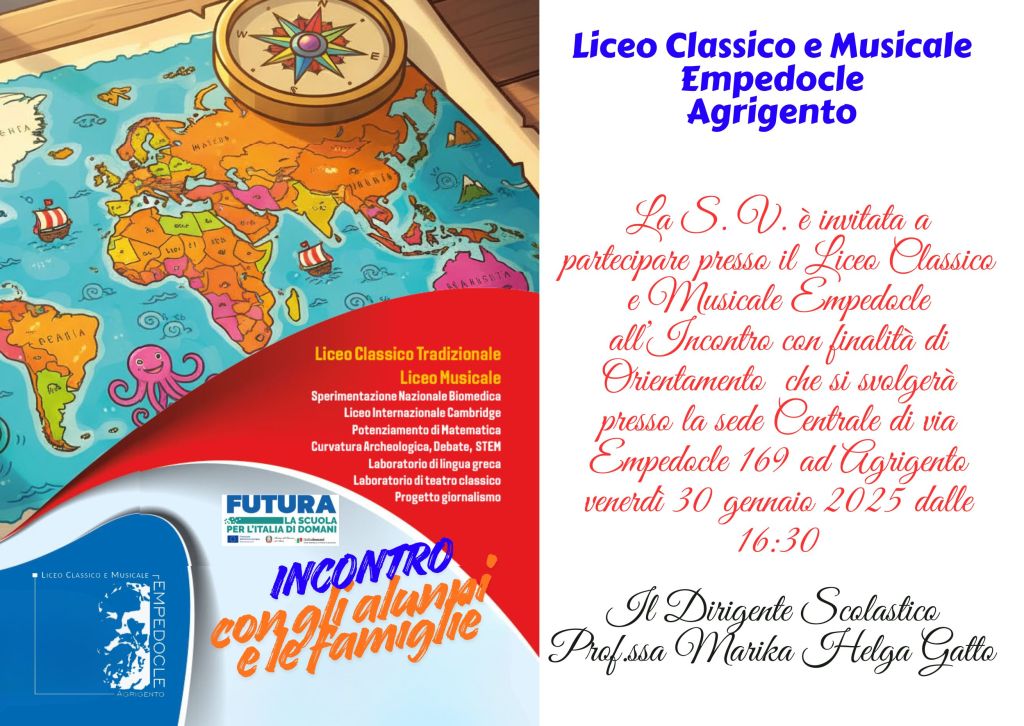 Il Liceo Classico e Musicale “Empedocle” venerdì 30 gennaio dalle ore 16:30 alle ore 18:00 presso la sede centrale, sita in via Empedocle n.169, promuove un incontro con finalità orientative aperto a tutti gli studenti delle classi terze della scuola secondaria di primo grado ed alle loro famiglie. Con l’occasione potranno essere visitati i locali scolastici, i laboratori e le aule speciali (immersiva e STEM) dell’Istituto e si potranno avere delle informazioni più dettagliate da parte del personale docente sugli indirizzi di studio, ossia: Liceo classico Tradizionale, Liceo musicale, Liceo classico con potenziamento di Matematica, Liceo Internazionale Cambridge, Sperimentazione nazionale liceo biomedico, Liceo classico a curvatura archeologica.