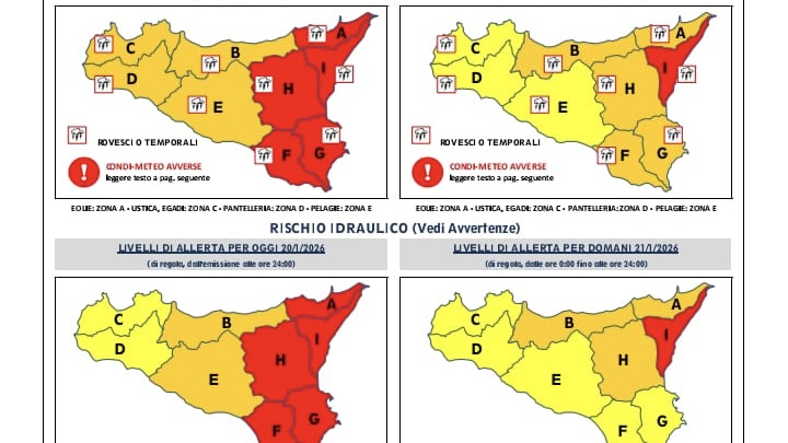 Il dipartimento della Protezione civile della Regione Siciliana ha diramato il nuovo bollettino per il rischio meteo-idrogeologico e idraulico per la giornata di domani, mercoledì 21 gennaio. Permane l’allerta rossa su Catania mentre nel resto dell’isola le condizioni dovrebbero migliorare: è prevista allerta gialla sulle province di Palermo, Messina e Agrigento, arancione nel resto della Sicilia.