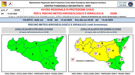 La Protezione Civile Regionale ha diffuso un avviso per il rischio meteo-idrogeologico ed idraulico, valido fino alle 24 di domani, martedì 14 ottobre. Per la giornata di domani, su gran parte della Sicilia è prevista allerta gialla.