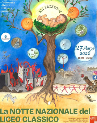 A questo tema si ispireranno le attività e le performance preparate dagli studenti dei licei partecipanti. All’idea dell’humanitas si collegano anche i due elementi simbolici che accompagneranno l’edizione 2026: il brano inedito La fioritura del cantautore fiorentino Francesco Rainero, che aprirà la serata con un video realizzato dal regista Vladimir Di Prima, e la locandina ufficiale realizzata dall’artista Valeria Sanfilippo. L’immagine propone una metafora visiva della trasmissione dell’umanità nel tempo: al centro della composizione un neonato accolto tra i rami di un albero luminoso rappresenta la promessa del futuro, mentre sotto di lui un mondo segnato da guerra e distruzione ricorda i rischi della barbarie. L’albero, radicato nella terra e proteso verso la luce, diventa così simbolo della tradizione classica, capace ancora oggi di custodire e trasmettere il seme dell’humanitas alle nuove generazioni. La Notte Nazionale del Liceo Classico nasce con l’intento di mostrare al grande pubblico la vitalità di questo indirizzo di studi, spesso al centro del dibattito culturale. Nel corso degli anni la manifestazione è diventata un appuntamento atteso, capace di attirare l’attenzione dei media e di coinvolgere migliaia di studenti, docenti e cittadini.