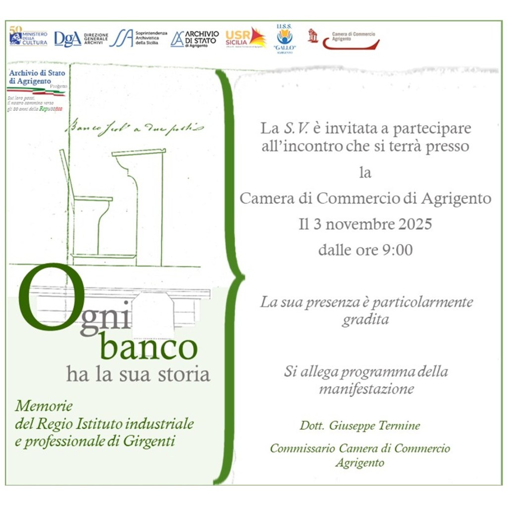 Lunedì 3 novembre 2025, alle ore 9:00, presso la Camera di Commercio di Agrigento (Piazza Gallo), si terrà l’incontro dal titolo “Ogni banco ha la sua storia”, iniziativa promossa dall’Archivio di Stato di Agrigento nell’ambito del progetto “Sui loro passi, il nostro cammino verso gli 80 anni della Repubblica”, a cura del Ministero della Cultura, Direzione Generale Archivi, Soprintendenza Archivistica della Sicilia, e con la collaborazione dell’USR Sicilia, dell’I.I.S.S. “Gallo” di Agrigento e della Camera di Commercio di Agrigento.