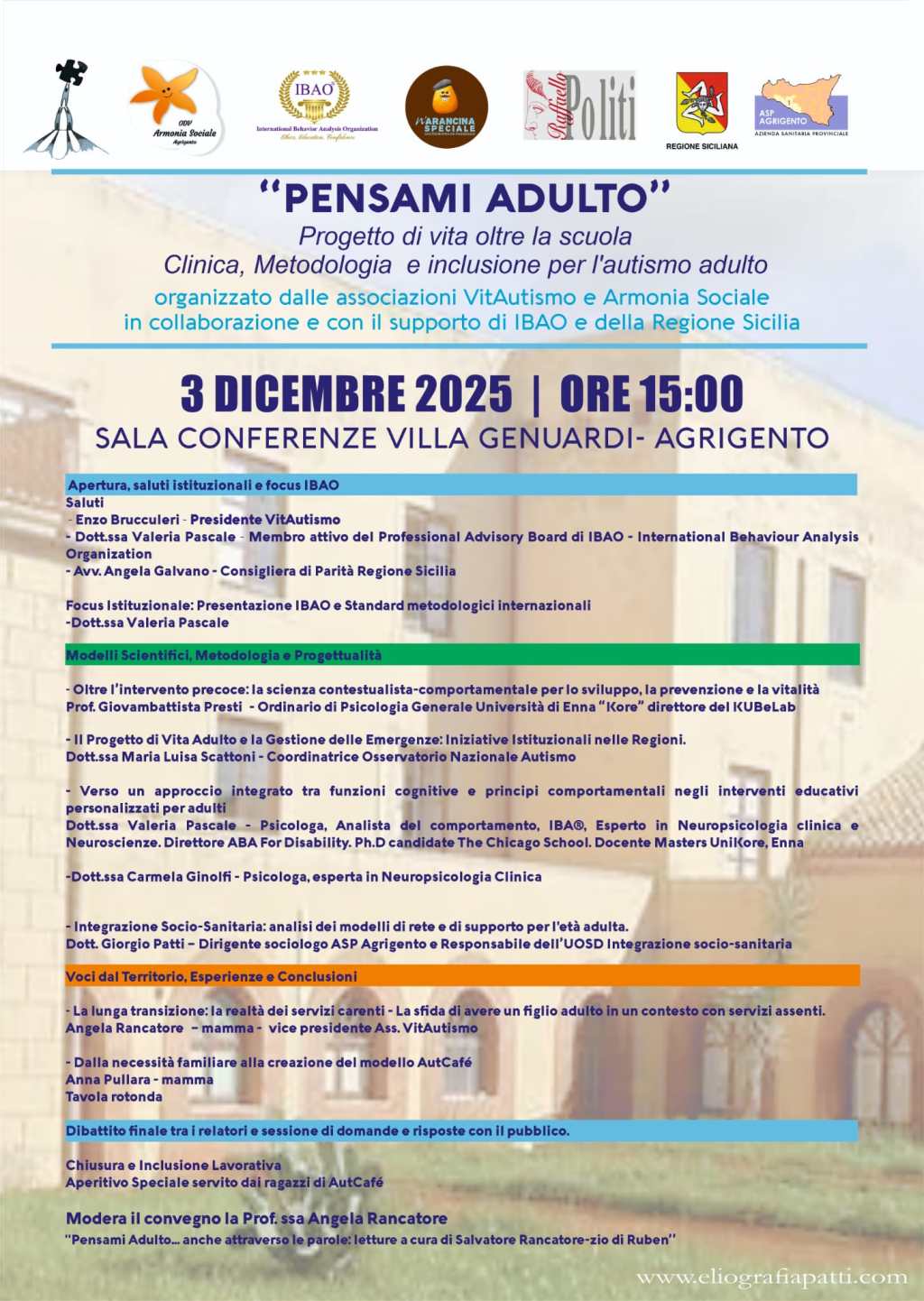Le Associazioni Armonia Sociale e VitAutismo, con il patrocinio della Regione Sicilia e la prestigiosa partnership di IBAO® (International Behaviour Analysis Organization), sono liete di presentare il convegno “Pensami adulto – progetto di vita oltre la scuola”. L’evento si terrà il prossimo 3 dicembre 2025, dalle ore 15:00 alle 18:30, nella storica cornice di Villa Genuardi (via U. La Malfa, Agrigento).