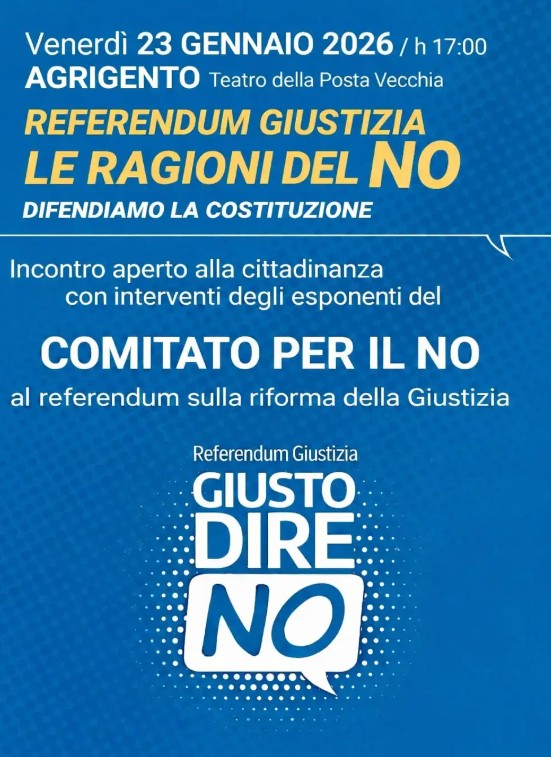 Dopo l’evento di ieri al Rouge et noir di Palermo, si avvicina l’iniziativa in territorio agrigentino.  avente per tema “Referendum Giustizia – Le ragioni del No. Difendiamo la Costituzione”, organizzato dal “Comitato per il No” dell’Associazione nazionale magistrati, Il 23 gennaio, infatti, alle ore 17 il Teatro della Posta vecchia ospiterà un incontro aperto alla cittadinanza per esporre le ragioni del No.