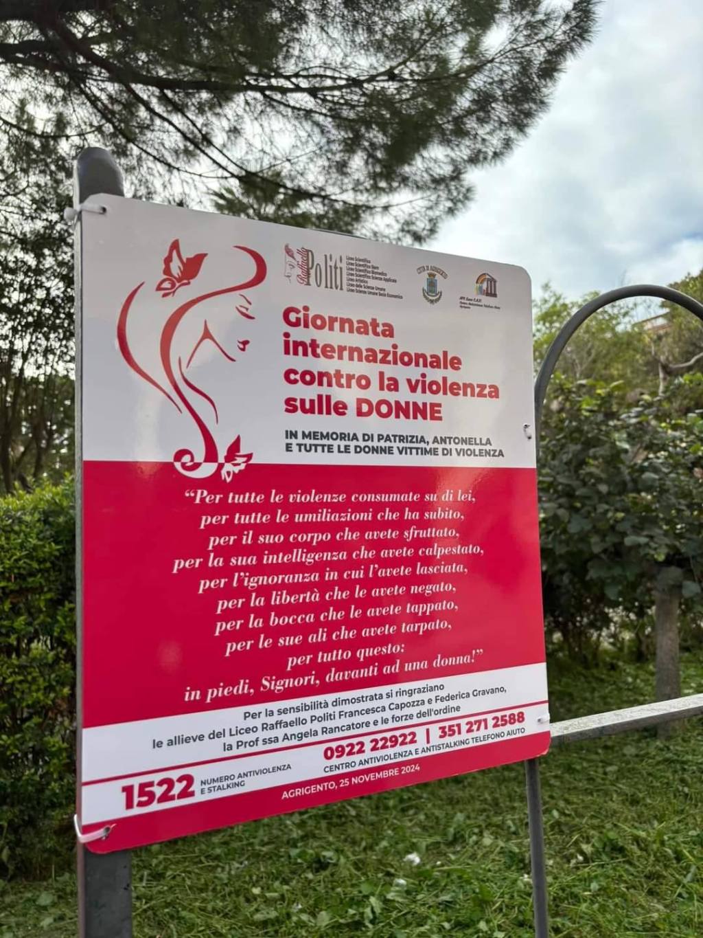 Scomparsa la targa che, lo scorso 25 novembre, era stata apposta accanto ad una panchina, collocata di fronte la Prefettura di Agrigento, dipinta a mano da due alunne del Liceo Politi, in occasione della Giornata internazionale per l’eliminazione della violenza contro le donne. E’ quanto viene denunciato, con dispiacere e amarezza, da Angela Rancatore, docente dell’istituto scolastico, che aveva portato avanti l’iniziativa insieme al Comune di Agrigento e al Centro Antiviolenza e Antistalking Telefono Aiuto di Agrigento.
