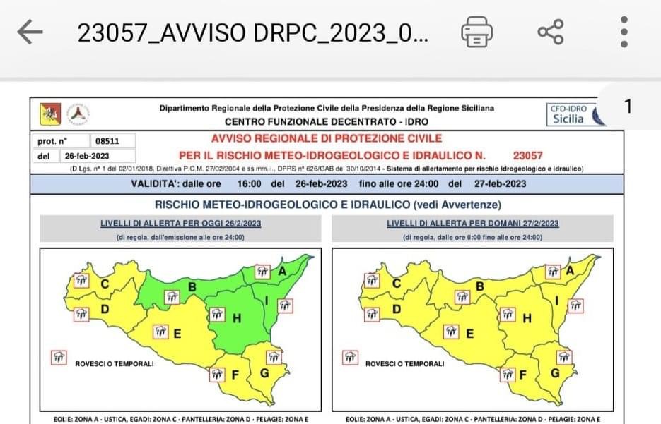 Il dipartimento della Protezione Civile della Regione Siciliana ha diramato l’Allerta Gialla con validità dalle ore 16:00 del 26/02/2023 fino alle ore 24:00 del 27/02/2023.
