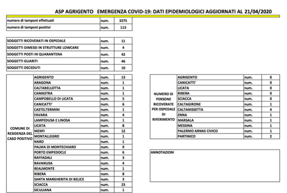 Questi i dati comune per comune forniti dall’Asp: Agrigento (13); Aragona (1); Caltabellotta (1); Camastra (1); Campobello di Licata (6); Canicattì (6); Casteltermini (1); Favara (4); Lampedusa (1); Licata (8); Menfi (12); Montallegro (1); Naro (1); Palma di Montechiaro (9); Porto Empedocle (6); Raffadali (3); Ravanusa (3); Realmonte (1);Ribera (8); Santa Margherita Belice (3); Sciacca (23); Siculiana (1).