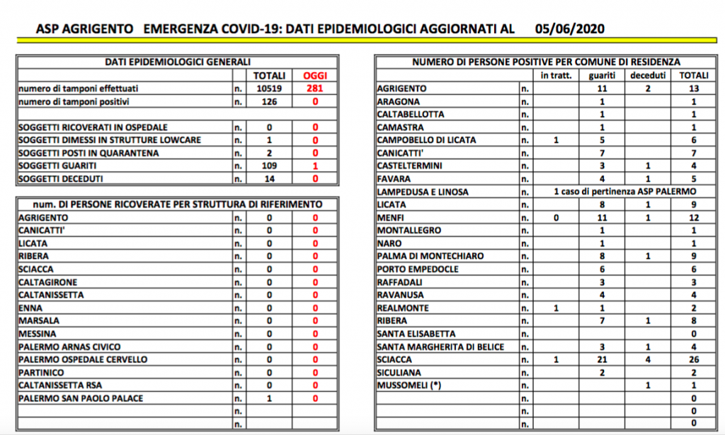 Ancora una giornata senza nessun nuovo contagio in provincia di Agrigento. Arriva anche un’altra buona notizia: scende il numero degli attuali positivi con una guarigione accertata a Casteltermini che porta azzera di fatto i contagiati nel piccolo centro dell’agrigentino. Insomma, sono numeri confortanti e sempre più vicini allo “zero” quelli relativi alla nostra provincia in tema di Coronavirus. I tamponi eseguiti oggi dall’Asp di Agrigento sono 281, tutti negativi, e portano il totale dei test a 10519. Dall’inizio della pandemia sono 126 i positivi ma 109 persone hanno ormai sconfitto il virus. Due i soggetti posti in quarantena obbligatoria una invece si trova al San Paolo Palace di Palermo. Sempre fermo a 14 il numero delle vittime. Attualmente in provincia ci sono tre positivi: Realmonte, Sciacca e Campobello di Licata. C’è ancora un contagio a Lampedusa (ma fa riferimento all’Asp di Palermo).
