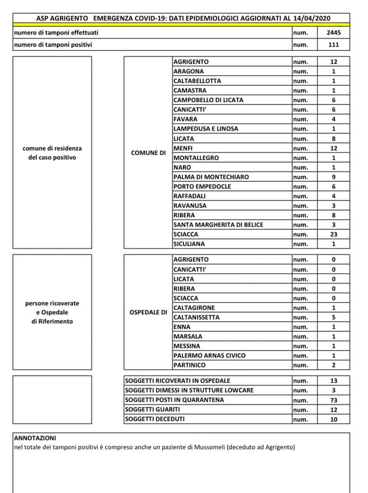 Tredici (13) i pazienti agrigentini positivi ricoverati: cinque a Caltanissetta, due a Partinico e uno rispettivamente a Messina, Marsala, Enna e Caltagirone e Palermo. Tre i soggetti dimessi e che dovranno effettuare la quarantena. Settantatré (73) le persone in quarantena obbligatoria . Dodici (12) le persone guarite completamente. Dieci (10), purtroppo, i decessi.