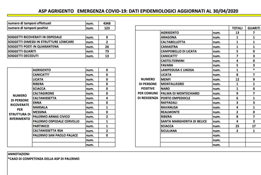 Ecco il dato comune per comune con contagi accertati ma anche guarigioni: Agrigento (13 casi di cui 7 guariti); Aragona (1 caso di cui 1 guarigione); Caltabellotta (1 di cui 1 guarito); Camastra (1 di cui 1 guarito); Campobello di Licata (5); Canicattì (7 casi di cui 3 guarigioni accertate); Casteltermini (4); Favara (5 casi di cui 3 guarigioni); Lampedusa (1); Licata (8 casi di cui 7 guairti)Menfi (12 casi di cui 9 guariti); Montallegro (1 di cui 1 guarito); Naro (1); Palma di Montechiaro (9 casi di cui 7 guarigioni); Porto Empedocle (6 casi di cui 1 guarigione); Raffadali (3 casi che risultati tutti guariti); Ravanusa (4 casi di cui 1 guarigione); Realmonte (2); Ribera (8 casi di cui 7 guariti); Santa Margherita Belice (4 casi di cui 3 guariti); Sciacca (25 casi di cui 17 guariti); Siculiana (2 di cui 1 caso che è risultato guarito).