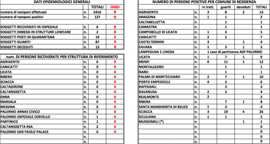 Agrigento: 13 casi totali – 8 guariti – 2 deceduti