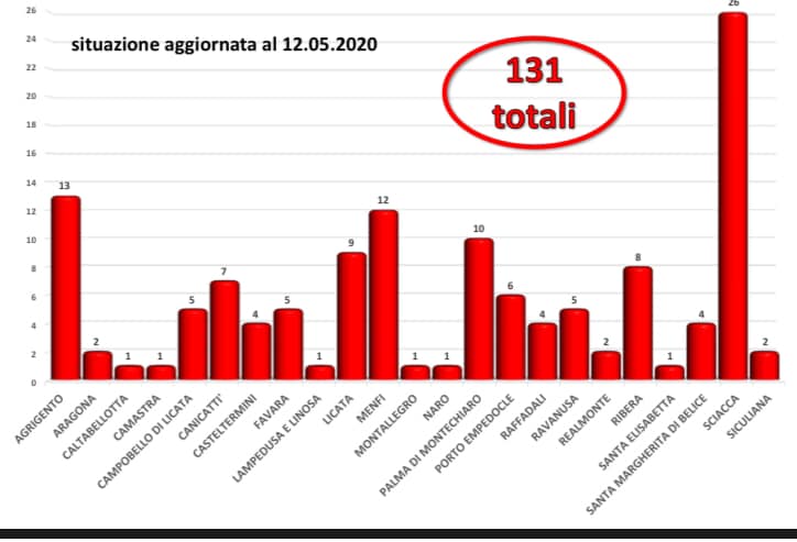 C’è il primo caso di Coronavirus a Santa Elisabetta mentre si registra un altro contagio anche a Raffadali dove è risultato positivo un dipendente dell’Asp di Agrigento. Un altro positivo anche a Ravanusa dove adesso gli attuali contagi sono 3. E’ quanto emerge dall’ultimo report diffuso dall’azienda sanitaria provinciale. Per Santa Elisabetta è una primissima volta. Sale a 131 il numero totale dei contagi in provincia di Agrigento anche se i soggetti guariti sono 91 (mancano però i casi di Agrigento e Realmonte dove i rispettivi sindaci hanno dichiarato l’avvenuta guarigione di due concittadini). I tamponi eseguiti oggi sono stati 140 che porta il totale a 5717.