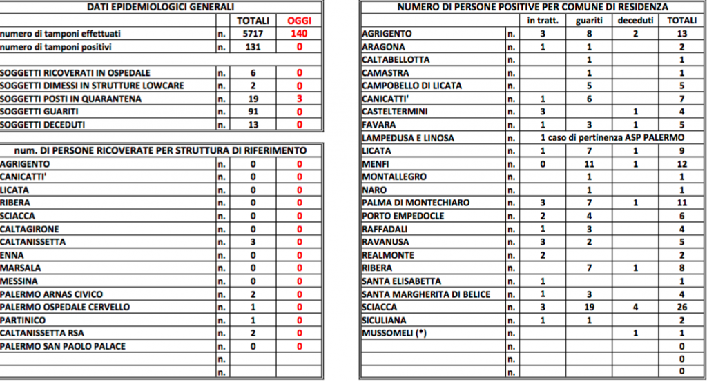 Aumenta anche il numero delle persone in quarantena obbligatoria – da 16 a 19. Invariati tutti gli altri numeri: 13 le vittime, 2 i soggetti dimessi in strutture lowcare. Questi, invece, i pazienti agrigentini ricoverati in strutture ospedaliere: tre (3) a Caltanissetta; una (1) , Partinico, Palermo ospedale Cervello; due (2) all’ospedale Civico di Palermo e due (2) in una residenza sanitaria assistenziale a Caltanissetta.