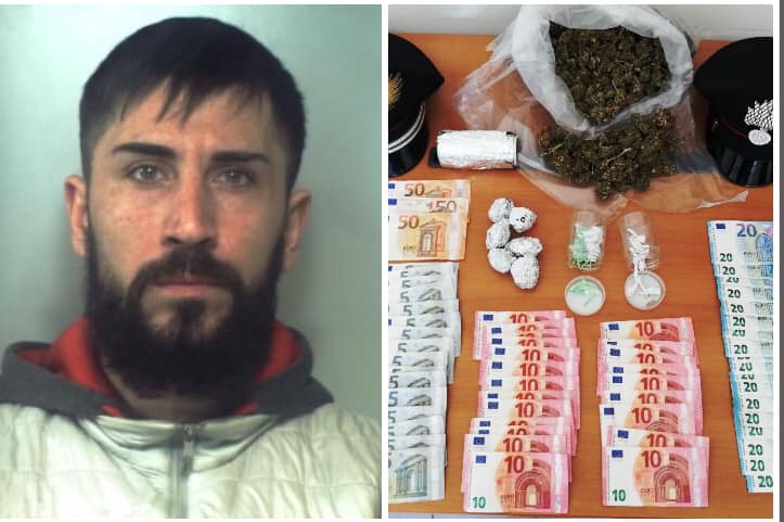Inseguito e bloccato mentre tentava di fuggire per le scale del palazzo, è stato perquisito sul posto e trovato in possesso di: 5 grammi di cocaina, 6 grammi di crack e 15 grammi di marijuana, tutte sostanze suddivise in dosi, nonché di 815 euro in contanti, presumibilmente incassati dalla pregressa vendita degli stupefacenti.I carabinieri, ispezionando la zona interessata dall’attività illecita, hanno rinvenuto e sequestrato altri 450 grammi di marijuana e 5 grammi di crack, occultati all’interno del vano ascensore del condominio.L’arrestato, in attesa della direttissima, è stato relegato agli arresti domiciliari.