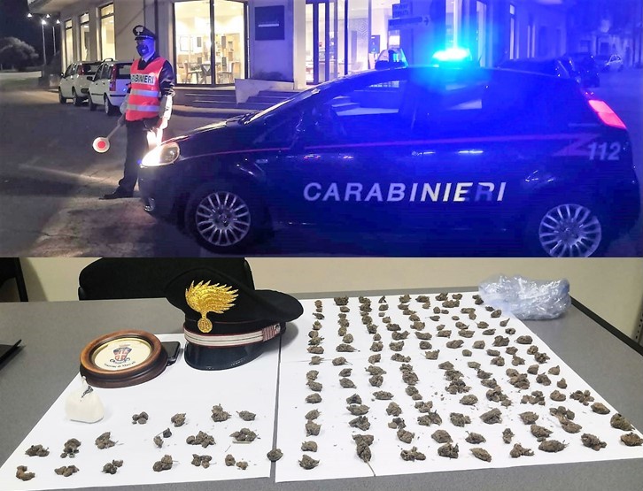 La scorsa notte a Mascali, sulla SS 114,  nell’ambito servizio preventivo volto alla vigilanza sul rispetto delle misure disposte per il contenimento della pandemia da covid-19, i militari di pattugli hanno imposto l’alt ad un motociclo Malaguti 150 con a bordo i due soggetti. Beccati a gironzolare di notte, hanno mostrato un eccessivo nervosismo che ha indotto gli operanti a perquisirli sul posto. Perquisizione personale che ha consentito ai carabinieri di rinvenire e sequestrare oltre 30 grammi di cocaina e 100 grammi di marijuana, quest’ultima sostanza già suddivisa in 150 dosi  pronte ad essere smerciate. Ad ognuno degli arrestati  è stata altresì  elevata la sanzione di 400 euro prevista per chi vìola le norme di legge che impongono alle persone di rimanere in casa dalle ore 22:00 alle ore 05:00 dell’indomani, nonché di non uscire dal proprio comune di residenza se non per ragioni che ne giustifichino lo spostamento.