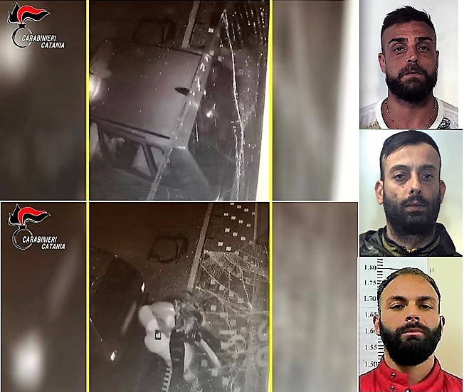 25.11.2019 in Sant’Agata Li Battiati (CT) – Il CHISARI, il COCULA e il DI VITA, utilizzando come ariete una Fiat Uno di colore verde (risultata rubata a Tremestieri Etneo lo stesso giorno), che, lanciata ad elevata velocità contro la vetrata di un negozio di abbigliamento, la infrangeva, e successivamente introducendosi all’interno dell’esercizio commerciale, si impossessavano di numerosi capi di vestiario per un valore di circa 4.500 euro.