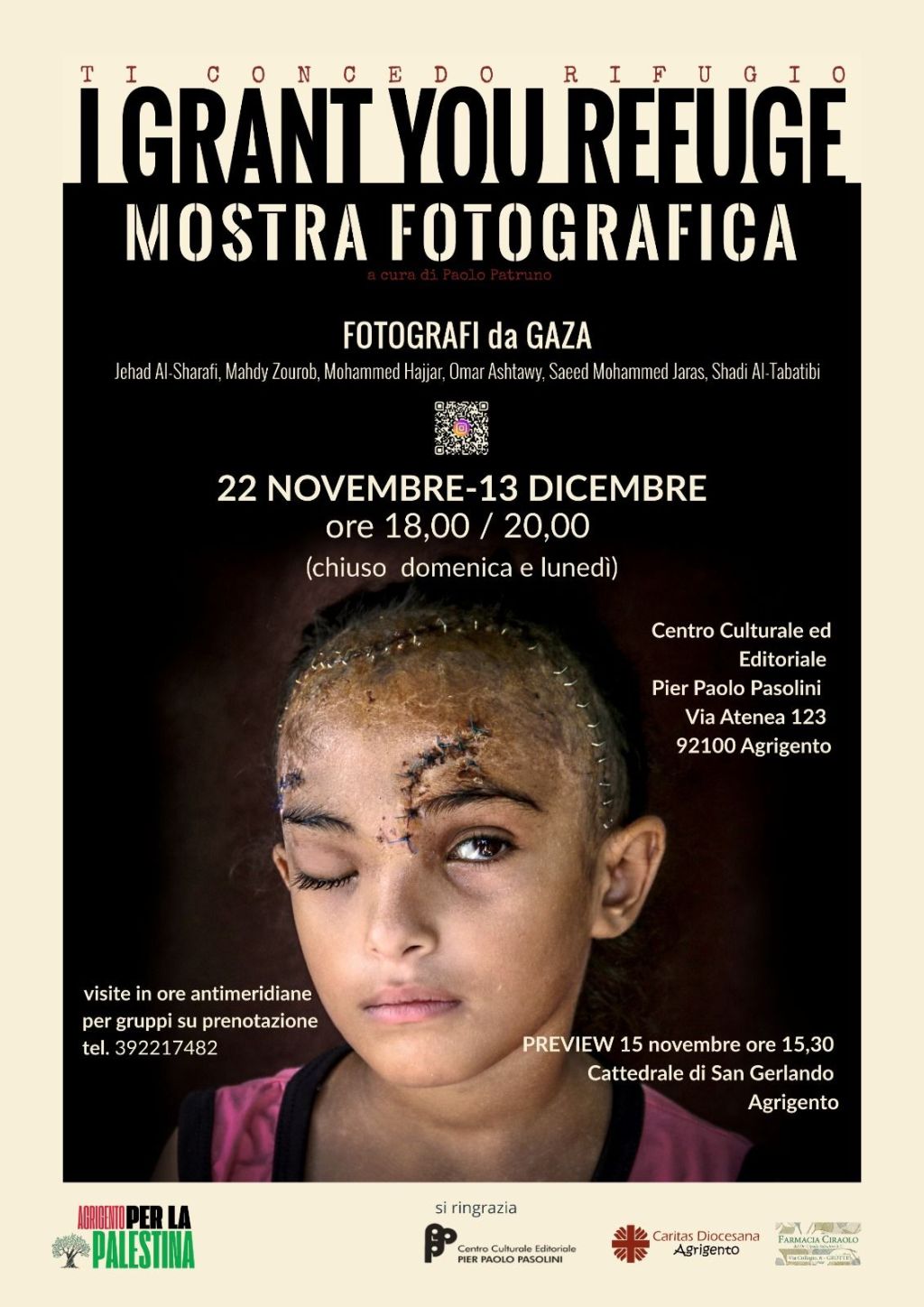 “I Grant You Refuge” – Fotografi da Gaza, sarà visitabile dal 22 novembre al 13 dicembre al Centro Culturale Pier Paolo Pasolini, di Agrigento, una anteprima della Mostra è in programma il prossimo 15 novembre alla Cattedrale di Agrigento