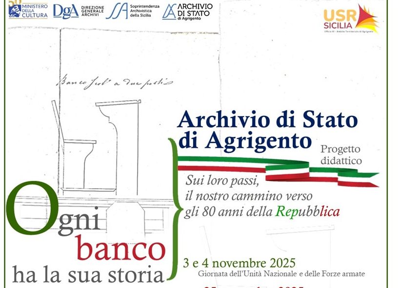 L‘Archivio di Stato di Agrigento avvia un nuovo progetto in previsione dell’ottantesimo anniversario della Repubblica Italiana. Il progetto denominato “Sui loro passi, il nostro cammino verso gli 80 anni della Repubblica”, che coniuga fonti archivistiche sulla storia della scuola e memorie storiche del territorio, si configura come un percorso di riflessione rispetto a temi storici, sociali e culturali, nel quale la storia delle istituzioni scolastiche della provincia di Agrigento rappresenta il fil rouge. Sul tema trasversale “Ogni banco ha la sua storia”, saranno affrontate otto tappe tematiche, funzionali al racconto degli 80 anni della storia della Repubblica Italiana. Il progetto, sostenuto dall’USR Sicilia – Ufficio IV Ambito territoriale di Agrigento per la diffusione presso le scuole della provincia di Agrigento, persegue la finalità di far conoscere il patrimonio archivistico dell’Archivio di Stato di Agrigento e i percorsi culturali posti in essere e il ruolo degli archivi nel processo di ricostruzione della memoria collettiva, coinvolgendo, soprattutto, le nuove generazioni.