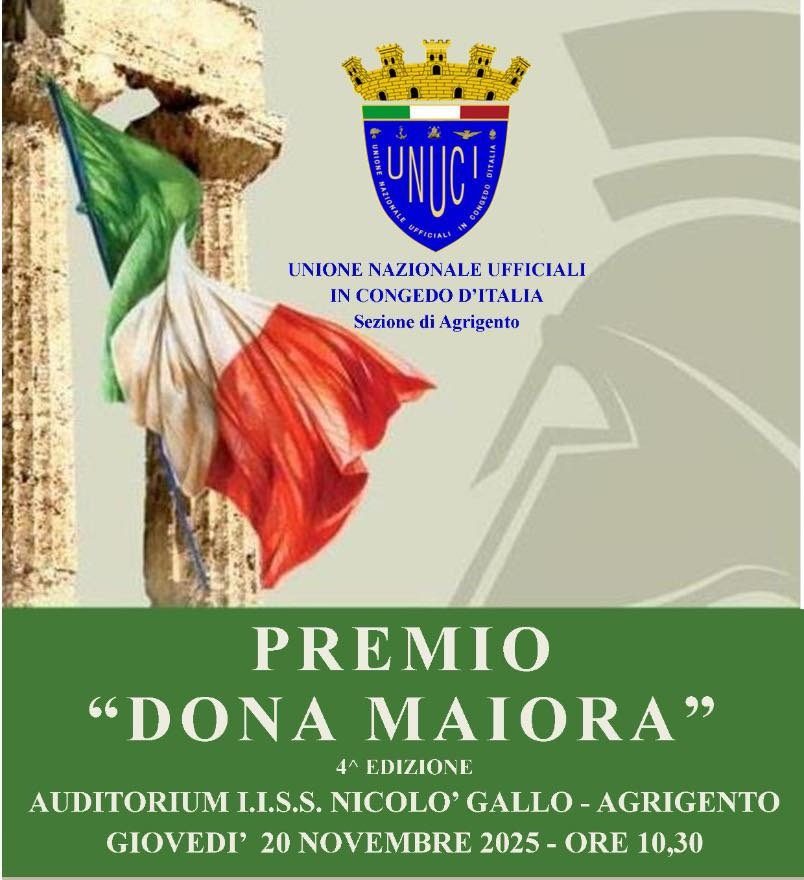 Ad Agrigento martedì 11 novembre, alle ore 9,30, presso il Circolo Culturale Empedocleo, si terrà la conferenza stampa di presentazione del Premio “Dona Maiora”, un riconoscimento dedicato al coraggio, alla dedizione e al senso del dovere degli uomini e delle donne appartenenti alle Forze Armate e alle Forze dell’Ordine italiane. Il premio è promosso dalla sezione di Agrigento dell’Unione Nazionale Ufficiali in Congedo d’Italia (UNUCI) e rappresenta un momento di alto valore civile e morale, volto a sottolineare l’impegno quotidiano di chi opera per la sicurezza e la tutela della collettività.