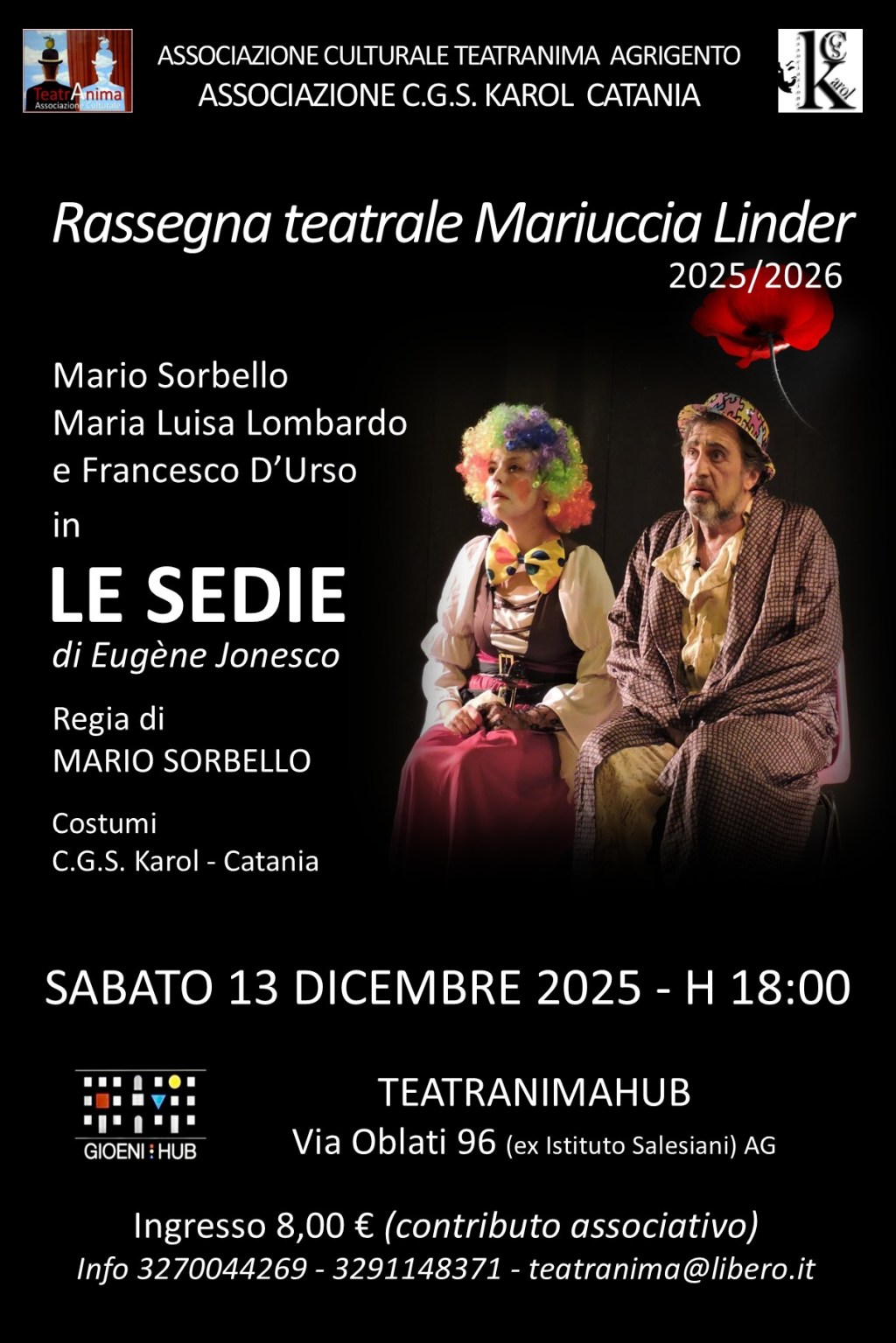 Sabato 13 dicembre, alle ore 18:00, nella sala del Teatranimahub, il nuovo centro culturale realizzato dalla Associazione Culturale TeatrAnima all’interno dell’ex Istituto Gioeni/Salesiani di Via Oblati 96, andrà in scena “Le sedie” farsa tragica appartenente al filone del teatro dell’assurdo, di Eugène Jonesco. Interpreti Mario Sorbello, Maria Luisa Lombardo e Francesco D’Urso. Regia Mario Sorbello.