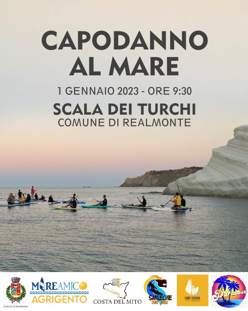 Un tuffo collettivo alla Scala dei Turchi aprirà il nuovo anno, sulla Costa del Mito, nella parte sud-occidentale della Sicilia. Nella spiaggetta a est della scogliera di marna bianca, nel Comune di Realmonte, è previsto un bagno nelle acque del Mediterraneo e poi una breve traversata a remi su tavole da sup, da un lato all’altro del promontorio.
