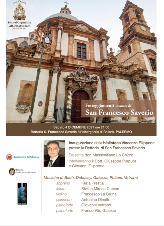 Saranno due i concerti che concluderanno a Palermo la XIX edizione del Festival organistico Albert Schweitzer 2021. L’evento, organizzato come ogni anno, dal maestro di origini palermitane, Franco Vito Gaiezza, si svolgerà sabato 4 dicembre alle 21.00, nella Rettoria di San Francesco Saverio all’Albergheria di Ballarò e, il 18 dicembre alle 21.00, nella chiesa S. […]