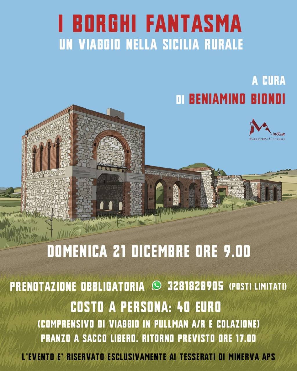 L’itinerario si ispira al libro di Beniamino Biondi, un testo fondamentale per comprendere la storia dei borghi fantasma, luoghi che furono protagonisti di un ambizioso progetto di modernizzazione agricola e sociale, ma che oggi giacciono nell’oblio, testimoni silenziosi di un passato complesso e affascinante. Il viaggio permetterà ai partecipanti di immergersi nel paesaggio siciliano, che diventa un vero e proprio archivio di storie, di tracce lasciate dalla colonizzazione rurale, dalle prime sperimentazioni agrarie e dalla lotta per la terra, con uno sguardo rivolto al futuro di questi luoghi.