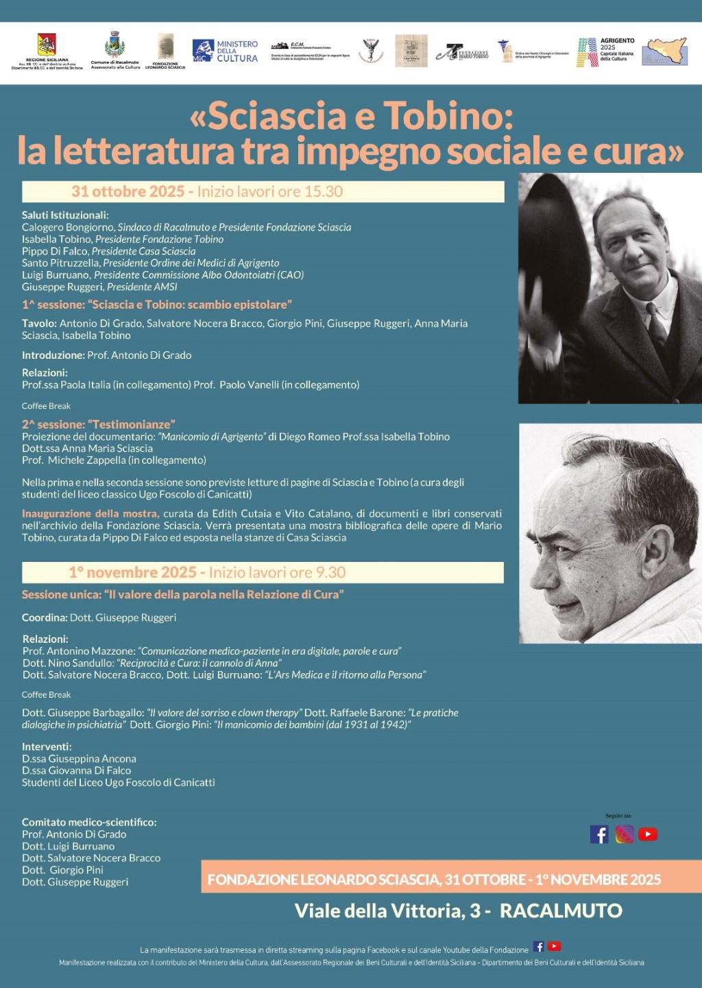 “Sciascia e Tobino: la letteratura tra impegno sociale e cura” è il titolo del convegno in programma venerdì e sabato prossimi, nella sede della Fondazione Leonardo Sciascia, in viale della Vittoria a Racalmuto.
