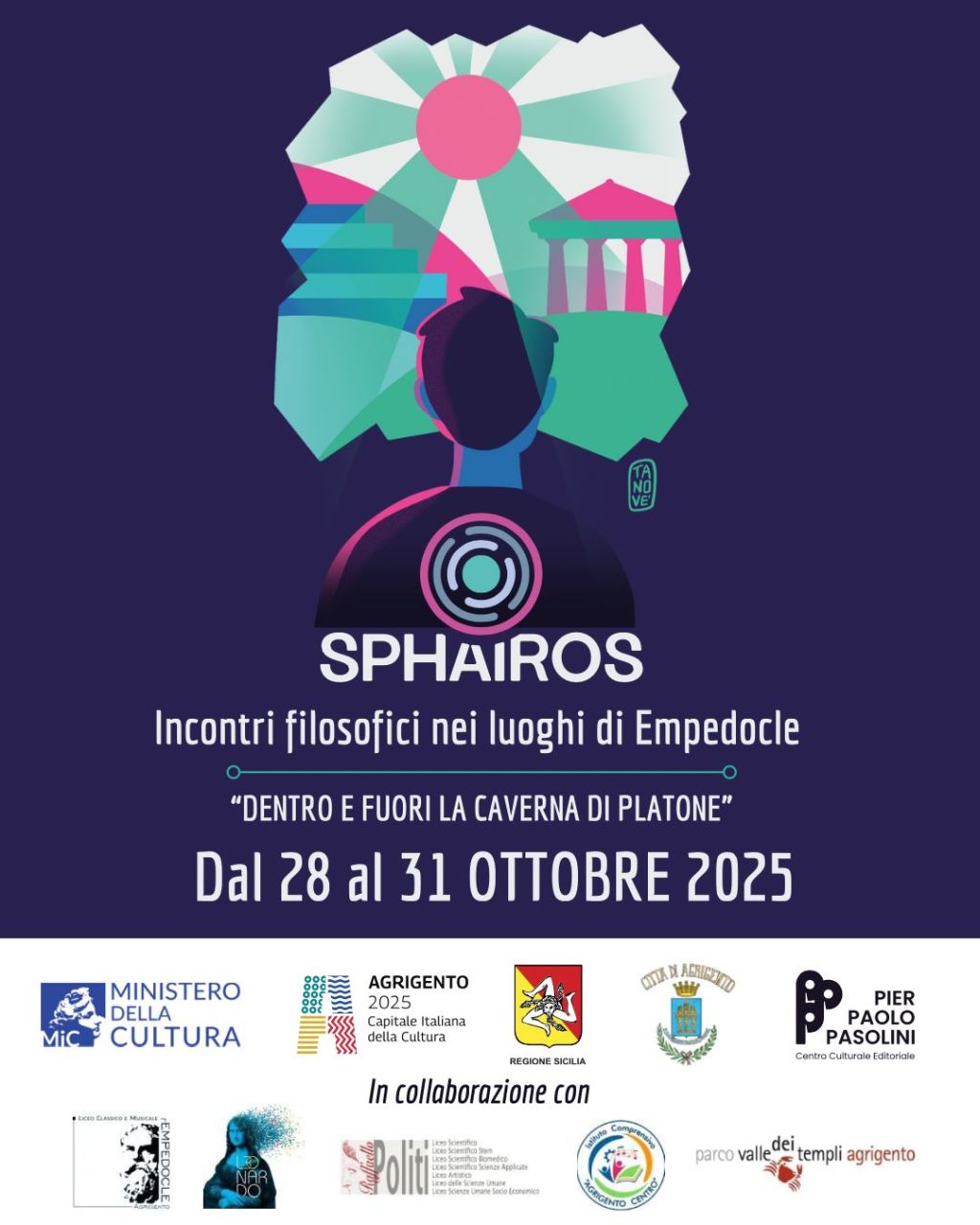 Quattro giorni per riflettere e ragionare, con il coinvolgimento degli studenti che avranno modo di parlare di filosofia e scienza, tra lectio, eventi e momenti di confronto. Tutto nel cuore della città, nei luoghi che raccontano la storia di una Agrigento millenaria. Dal 28 al 31 ottobre prenderà il via la prima edizione di “Sphairos – incontri filosofici nei luoghi di Empedocle”. L’evento, che è organizzato dal Centro culturale “Pier Paolo Pasolini” ed è finanziato dal Ministero della Cultura e dalla Fondazione Agrigento 2025, è parte del programma ufficiale di Agrigento Capitale italiana della Cultura e avrà come tema “Dentro e fuori dalla caverna di Platone”.