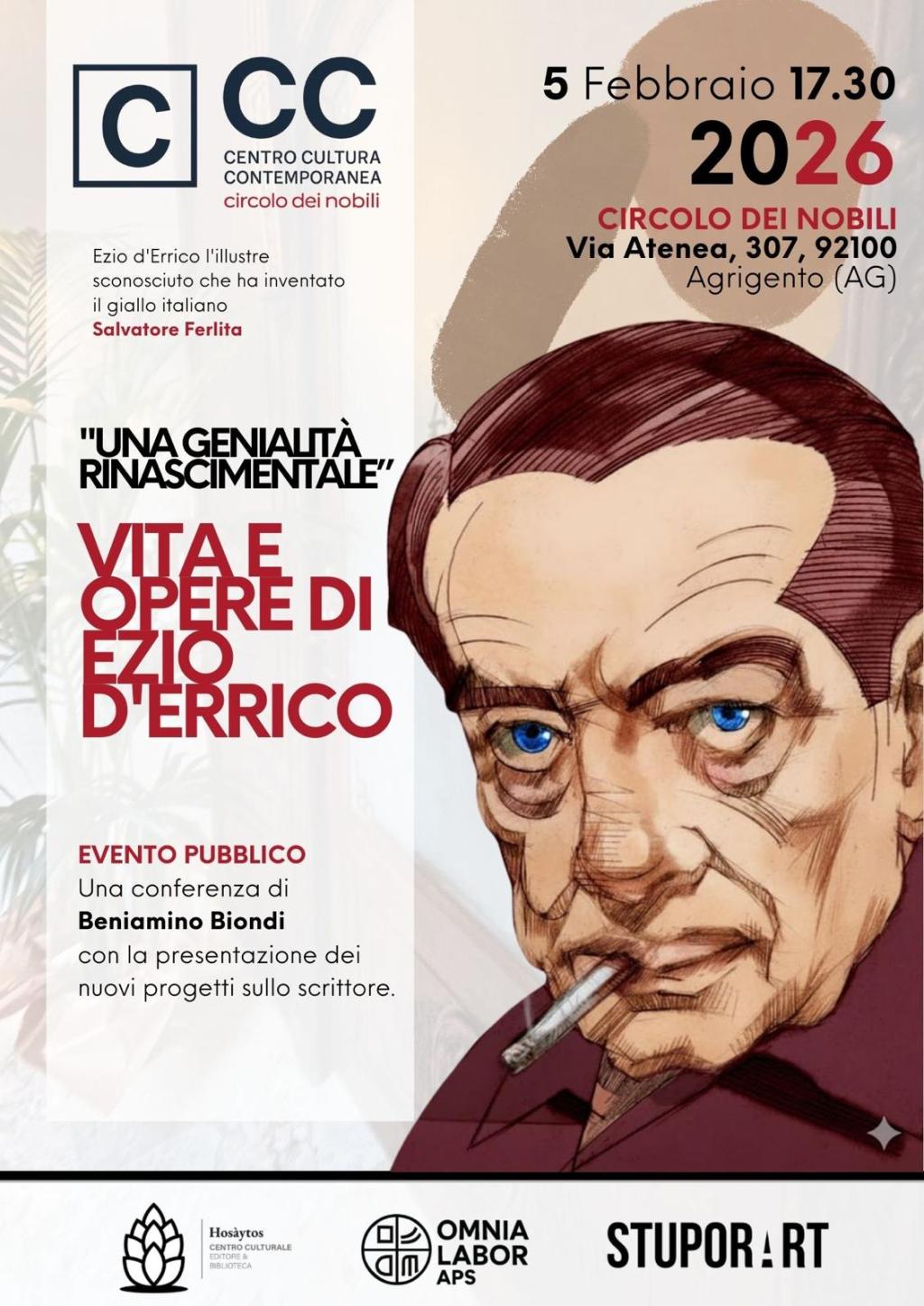 Giovedì 5 febbraio 2026 , alle ore 17.30, il Circolo dei Nobili di Agrigento (Via Atenea, 307) ospiterà l’evento pubblico “Una genialità rinascimentale. Vita e opere di Ezio d’Errico” , dedicato alla riscoperta di una delle figure più originali e ancora poco conosciute della letteratura italiana del Novecento.