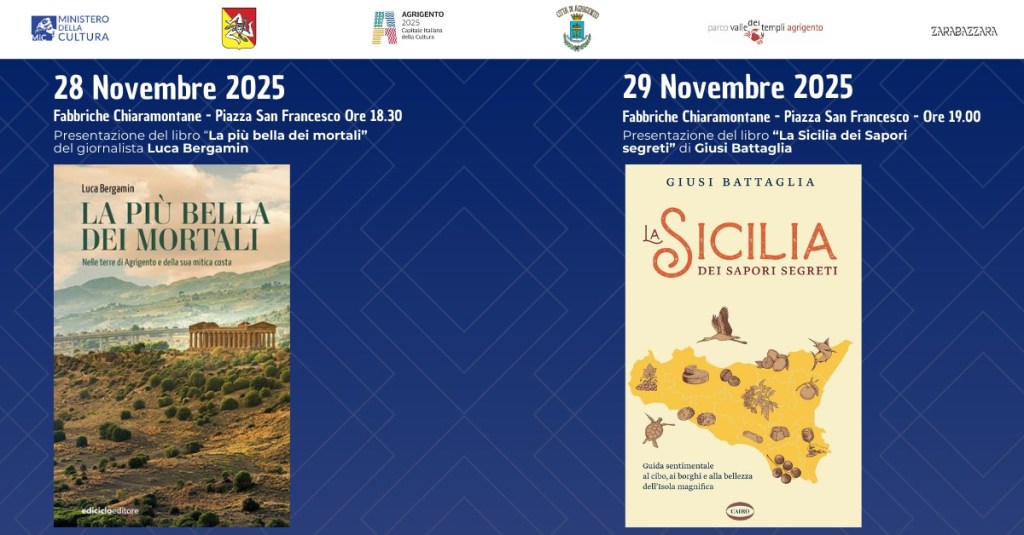 Domani, 28 novembre e dopodomani, 29 novembre, le Fabbriche Chiaramontane di piazza San Francesco ad Agrigento ospiteranno le presentazioni di due libri diversi ma intimamente legati nel contesto dell’iniziativa “Vivere Diodoros – Nutrire i territori”, che rientra nei 44 progetti del dossier di candidatura di Agrigento Capitale Italiana della Cultura 2025,  è organizzata dalla società Zarabbazzara per la Fondazione Agrigento 2025 in collaborazione con il Parco Archeologico e Paesaggistico della Valle dei Templi.