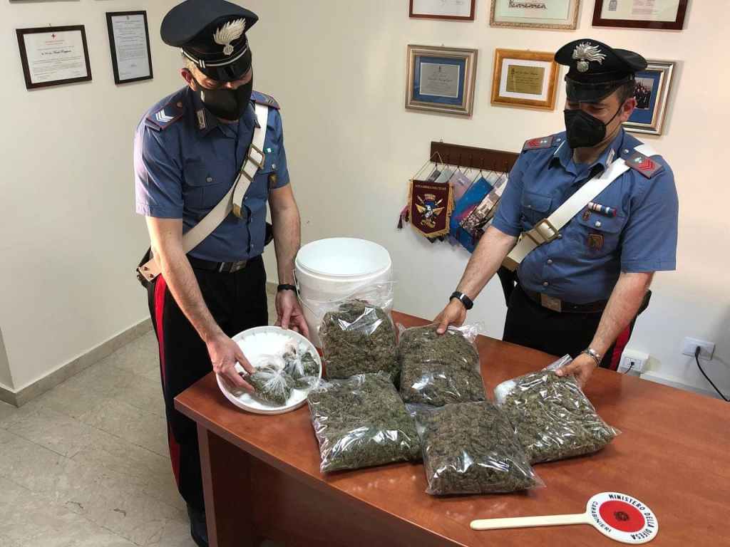 Richieste le chiavi del veicolo, quindi, i Carabinieri hanno effettuato una perquisizione domiciliare e veicolare e proprio all’interno del veicolo sospetto, utilizzato dall’uomo per la propria attività di artigiano nella lavorazione del cartongesso, i Carabinieri hanno rinvenuto sette “bustoni” in cellophane, alcuni dei quali nascosti all’interno di bidoni di vernice, contenenti complessivamente oltre 2,7 chili di sostanza vegetale, poi rivelatasi essere marijuana.