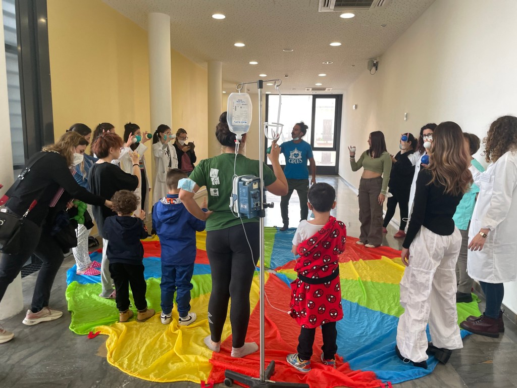 Prima si scioglie il ghiaccio ed ecco lo staff del Circ’opificio all’opera con le presentazione e il primo approccio pedagogico e pratico con i bambini. Quindi via alle attività: sorrisi, esercizi di consapevolezza del corpo, dell’equilibrio, del coordinamento ed ecco anche le mamme e lo stesso personale sanitario in prima linea insieme ai pazienti.