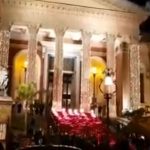 Davanti al teatro Massimo sventolano il Tricolore con la bandiera del Quirinale, da un lato, e quella della Unione europea dall’altro.