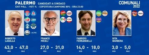 Secondo gli exit poll Opinio per Rai, alle elezioni comunali di Palermo Roberto Lagalla, candidato del centrodestra, si attesta fra il 43 e il 47% mentre Franco Miceli, in corsa per il centrosinistra e il M5S, sarebbe fra il 27 e il 31%.