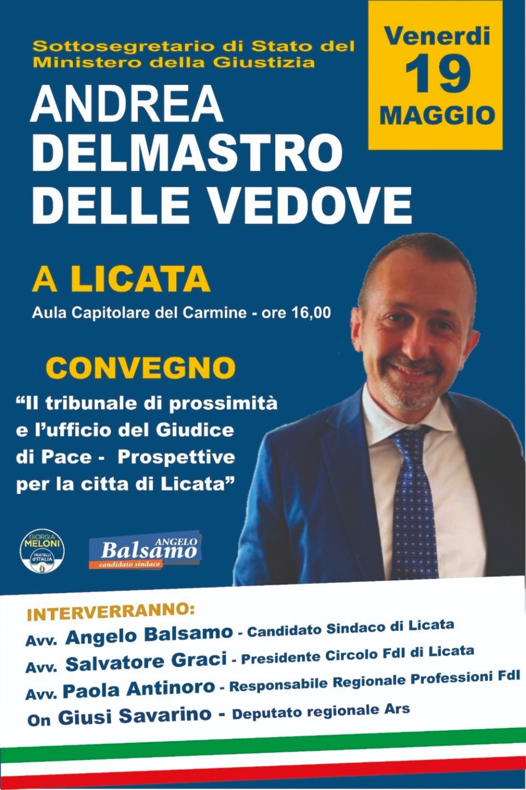Appuntamento a Licata domani con l’on. Andrea Delmastro, l’on Giusi Savarino e il candidato a Sindaco avv. Angelo Balsamo. Domani venerdì 19 Maggio alle ore 16 presso l’Aula Capitolare del Carmine a Licata sarà presente il Sottosegretario di Stato al Ministero della Giustizia, On.le Andrea Delmastro Delle Vedove, per una tavola rotonda dal tema “Il Tribunale di Prossimità e l’Ufficio del Giudice di Pace – Prospettive per la Città di Licata”. Un’occasione di dialogo e confronto a cui parteciperanno l’on. Giusi Savarino, deputato di Fratelli d’Italia in ARS e il candidato a Sindaco di Licata avv. Angelo Balsamo.