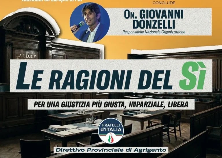 Si terrà venerdì 6 marzo alle ore 18.00, presso l’Hotel Kaos di Agrigento, l’incontro pubblico dal titolo “Le Ragioni del Sì”, promosso dal direttivo provinciale di Fratelli d’Italia in vista del referendum sulla giustizia in programma il 22 e 23 marzo 2026.