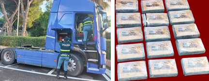 Erano i primi minuti di un ordinario servizio di vigilanza autostradale, in ore antimeridiane, quando, gli operatori della Sottosezione Polizia Stradale di Giardini Naxos, hanno intimato l’alt ad un trattore stradale nei pressi dello svincolo di Giardini Naxos dell’A/18 Messina-Catania, alla cui guida vi era un uomo di anni 52 anni, incensurato. Quello che sembrava essere inizialmente un riscontro di “routine” sulla corrispondenza tra la documentazione del veicolo e la finalità del viaggio, si è, però, ben presto trasformato in un riscontro di carattere penale. Il conducente del mezzo pesante, dipendente di una ditta di autotrasporto calabrese, ha mostrato, sin da subito, un evidente stato di agitazione, soprattutto nel corso del controllo della documentazione del veicolo, giustificando il viaggio in direzione del capoluogo etneo per asseriti problemi meccanici, riferendo, però, di non essere in possesso di alcun appuntamento con la ditta specializzata non sapendone neanche indicare la denominazione. Apparendo, pertanto, poco verosimile quanto narrato, il conducente ed il mezzo pesante sono stati sottoposti ad un’accurata perquisizione, al termine della quale sono stati rinvenuti 15 panetti di droga, confezionati con il noto marchio di una casa automobilistica, occultati all’interno del baule portaoggetti posto sulla fiancata destra del trattore stradale, oltre a 2.300,00 euro in contanti. I successivi accertamenti hanno, poi, confermato che si trattava di cocaina, per un peso complessivo di circa 15 kg, pronta a generare oltre 72.000 dosi che avrebbe fruttato oltre 2,5 milioni di euro se immessa sul mercato. Dopo gli adempimenti di rito, il conducente è stato tratto in arresto per traffico illecito di sostanze stupefacenti con l’aggravante dell’ingente quantità e posto a disposizione dell’Autorità Giudiziaria.