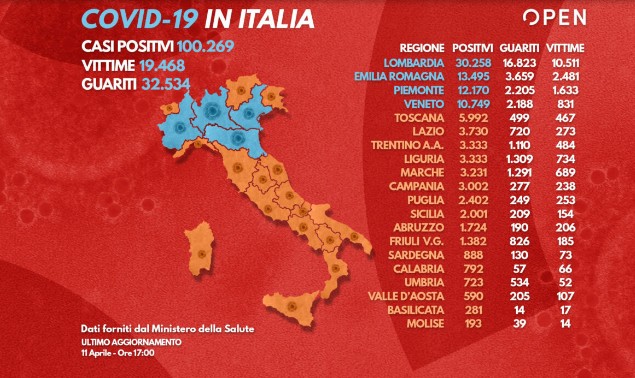 Con 619 vittime nelle ultime 24 ore per Coronavirus, il numero complessivo dei morti è salito a 19.468 (ieri erano 18.849). Secondo l’ultimo bollettino della Protezione civile illustrato da Angelo Borrelli i nuovi positivi sono 1.996, per un totale di 100.269 (ieri erano 98.273). Nell’ultimo giorno, sono stati effettuati 56.609 tamponi: il totale è di quasi un milione. I casi totali sono ora 152.271 , con un incremento di 4.694 in un giorno (ieri erano 147.577 e l’incremento di 3.951): il trend totale (comprensivo delle persone attualmente positive, dei deceduti e dei guariti) resta quindi in crescita, dice Borrelli.