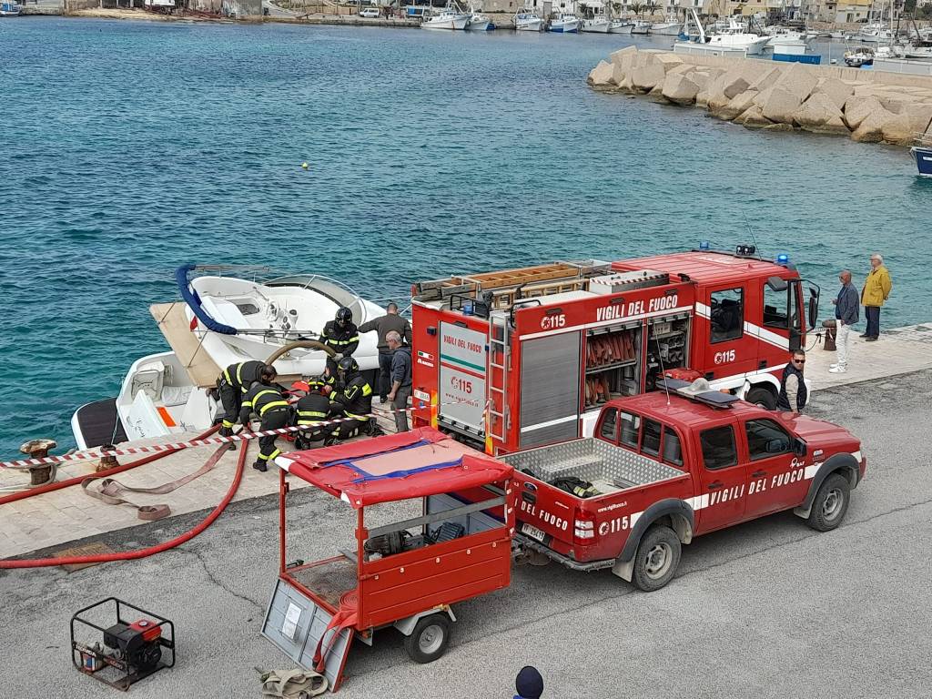 I vigili del fuoco stanno operando per mettere in sicurezza il natante presso il molo favarolo