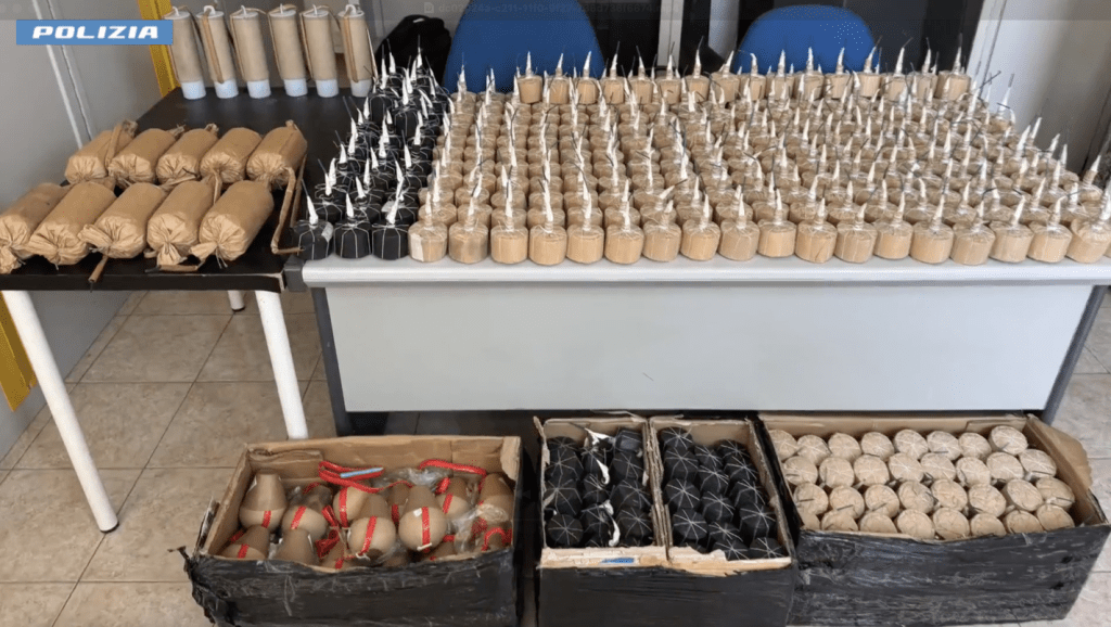Sul posto sono intervenuti poliziotti del nucleo Artificieri dell’Ufficio prevenzione generale e soccorso pubblico della Questura che hanno messo in sicurezza l’area per poi avviare i rilievi, aprendo gli scatoloni e trovando al loro interno centinaia di ordigni rudimentali, alcuni di grandi dimensioni. Dai primi accertamenti è emersa la pericolosità del materiale esplodente, composto da 1.042 ‘bombe carta’ e da 522 ‘palloni di Maradona’.