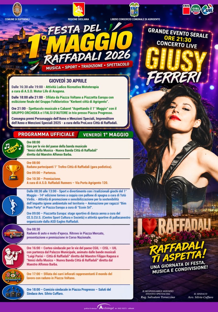 Nel pomeriggio, il programma entrerà nel vivo con il corteo sindacale organizzato da CGIL, CISL e UIL, accompagnato dalle bande musicali cittadine. A seguire, la tradizionale sfilata dei carri infiorati dedicati al mondo del lavoro e il comizio sindacale in Piazza Progresso, con i saluti del sindaco Silvio Cuffaro. Gran finale in serata con il concerto della cantante Giusy Ferreri, che chiuderà i festeggiamenti del 1° Maggio. Un programma ricco e variegato che unisce tradizione, cultura, sport e impegno civile, confermando Raffadali come punto di riferimento per le celebrazioni del lavoro e della comunità.