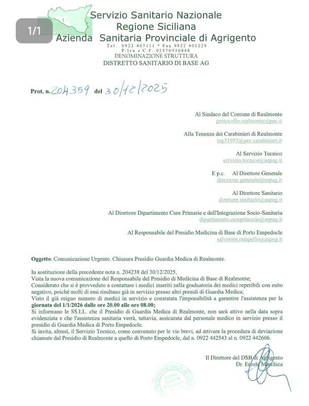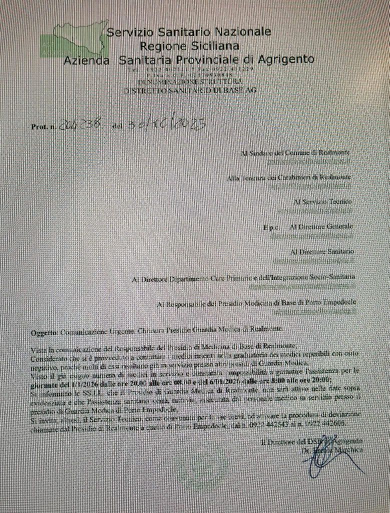 La Guardia medica di Realmonte sarà regolarmente aperta nella giornata del 6 gennaio 2026. Nelle scorse ore Grandangolo, carte alla mano e dopo aver fatto le necessarie verifiche, ha raccontato del provvedimento a firma del direttore del distretto Ercole Marchica (che pubblichiamo qui sotto) con il quale si comunicava l’impossibilità a garantire il servizio per la mancanza di medici (prendendo atto di un errore materiale nel titolo (il 6 gennaio e non fino al 6 gennaio).