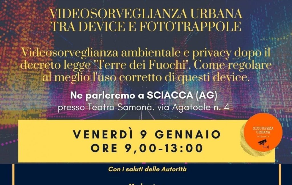 Il Comune di Sciacca ospiterà un convegno dedicato alla videosorveglianza ambientale e alla tutela dei dati personali, alla luce delle recenti novità normative introdotte dal decreto legge noto come “Terre dei Fuochi”.