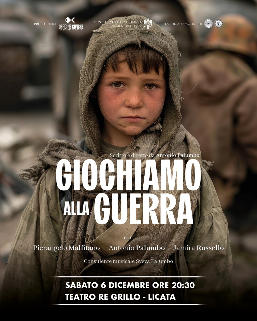 Arriva a Licata “Giochiamo alla guerra”, il reading teatrale prodotto da Officine Civiche, in scena sabato 6 dicembre alle 20:30 al Teatro Re Grillo di Licata. Un’opera che porta come sottotitolo una frase potente: «quando nascono sono figli delle loro mamma e dei loro papà, ma quando muoiono o sopravvivono alla guerra sono figli di tutti.»