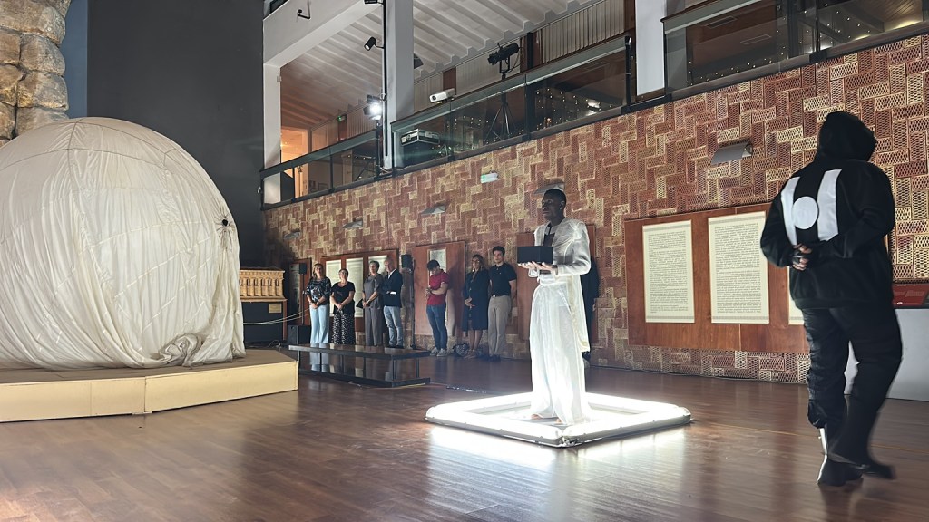 Un offertorio laico di oggetti, simboli, immagini. La performance di Simone Valsecchi nella sala Zeus del museo archeologico Griffo, nella Valle dei Templi di Agrigento, ha coinvolto sei attori che hanno dialogato con il suo mondo visionario . Una grande bolla trasparente per un automa formale che reca morte e violenza e combatte la bellezza e la conoscenza. Ma ne resta vinto  e traspira in una scultura vivente, sotto il Telamone che troneggia nella sala: ma la performance di Valsecchi – presentata la sera di giovedì 2 ottobre – non si esaurisce nello spazio della rappresentazione, piuttosto trova una nuova vita nel cosiddetto Museo della seconda scelta, ovvero i depositi del Museo che accolgono migliaia di reperti. Un luogo, la sala Francesco Sinatra, dove entrano di solito solo archeologi e studiosi, e che invece da mercoledì (8 ottobre) accoglieranno gli oggetti di scena di H I Am I, a partire dalla lunga veste nera coperta da 2654 conchiglie che Simone Valsecchi ha cucito personalmente, una per ciascun migrante scomparso in mare da gennaio a oggi. E ancora, altri oggetti, ognuno dal significato importante, in stretto dialogo con lo spazio, e con il tempo e il luogo attorno. Un’occasione unica, quella di H-I am I, per entrare in spazi di studio, dove ogni reperto pare aver trovato il suo posto.
