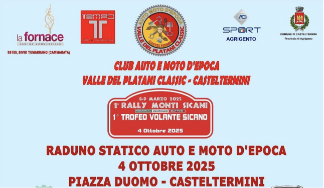 Sabato 4 ottobre a cura del “Club Auto e Moto d’epoca Valle del Platani Classic” si svolgerà, presso la Piazza Duomo di Casteltermini (AG), il “Raduno Statico di Auto e Moto d’epoca”.