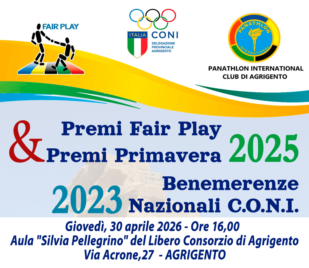 Si svolgerà presso la splendida cornice della sala conferenze “silvia pellegrino” del libero consorzio comunale di agrigento sita in via acrone, 27, giovedì, 30 aprile 2026, alle ore 16,00 la cerimonia di consegna dei premi primavera e premi fair play (alla memoria, alla carriera, alla solidarietà e per la promozione sportiva) assegnati dal panathlon club di agrigento per l’anno 2025 e delle benemerenze che la commissione nazionale del coni ha conferito ai dirigenti, tecnici e agli atleti campioni italiani assoluti per l’ anno agonistico 2023 e residenti nella provincia di agrigento.